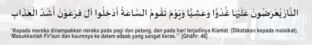 Fir’aun menentang Nabi Musa, lalu Firaun dan tentaranya disiksa dengan ditenggelamkan ke dalam laut. Mereka juga disiksa di dalam kubur sampai hari kiamat, sesuai dengan Firman Allah Ta’ala.