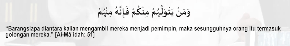 “Kamu tidak akan mendapati sebuah kaum yang beriman kepada Allah dan hari akhir berkasih sayang kepada orang yang menentang Allah dan rasulNya walaupun mereka adalah bapak-bapak mereka atau anak-anak mereka, atau saudara-saudara mereka, atau keluarga mereka. Mereka adalah orang yang telah Allah tetapkan keimanan dalam hati mereka dan Allah kuatkan dengan pertolongan dari Allah. Allah akan memasukkan mereka ke dalam surga yang mengalir di bawahnya sungai-sungai dan mereka kekal di dalamnya. Allah ridha kepada mereka dan merekapun ridha kepada Allah. Merekalah golongan Allah dan ketahuilah bahwa golongan Allah pasti akan menang” (QS. Al Mujadilah: 22)