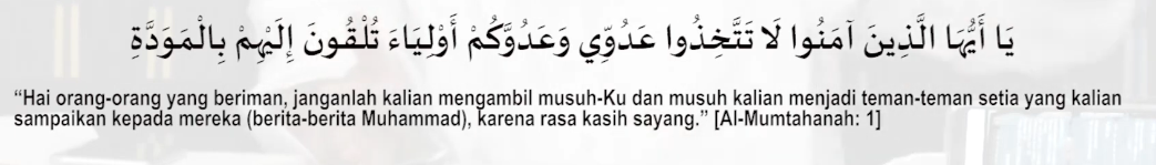 “Kamu tidak akan mendapati sebuah kaum yang beriman kepada Allah dan hari akhir berkasih sayang kepada orang yang menentang Allah dan rasulNya walaupun mereka adalah bapak-bapak mereka atau anak-anak mereka, atau saudara-saudara mereka, atau keluarga mereka. Mereka adalah orang yang telah Allah tetapkan keimanan dalam hati mereka dan Allah kuatkan dengan pertolongan dari Allah. Allah akan memasukkan mereka ke dalam surga yang mengalir di bawahnya sungai-sungai dan mereka kekal di dalamnya. Allah ridha kepada mereka dan merekapun ridha kepada Allah. Merekalah golongan Allah dan ketahuilah bahwa golongan Allah pasti akan menang” (QS. Al Mujadilah: 22)