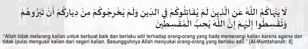 - Tidak dilarang berbuat baik kepada orang kafir apabila mereka berbuat baik kepada umat Islam (Surat Al-Mumtahanah Ayat 8)