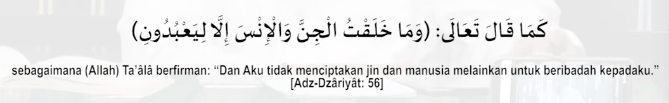 “Dan Aku tidak menciptakan jin dan manusia melainkan agar mereka beribadah kepadaKu” (QS. Adz Dzariat: 56)