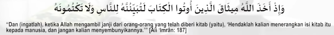 Terdapat kewajiban bagi yang mempunyai ilmu untuk menyampaikan kepada manusia apa yang diperintah dan apa yang dilarang. Sebagaimana Allah telah mengambil sumpah dalam firman-Nya: