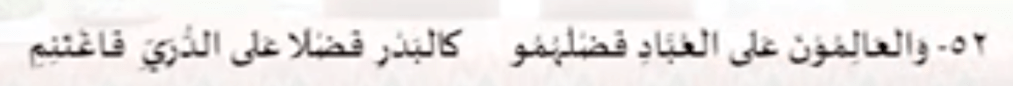 Bait Syair 52: Kelebihan para ahli ilmu atas para ahli ibadah … Adalah seperti kelebihan bulan purnama atas planet (bintang), maka manfaatkan hidupmu.Bait Syair 53: Seorang Alim yang bertakwa lebih berat bagi setan … Daripada seribu ahli ibadah semuanya.