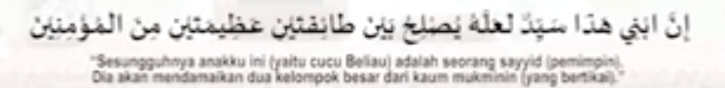 Sesungguhnya anaku ini (yaitu cucu Beliau) adalah seorang sayyid (pemimpin). Dia akan mendamaikan dua kelompok besar dari kaum mukminin (yang bertikai).