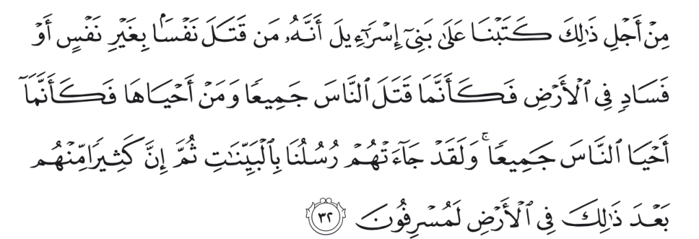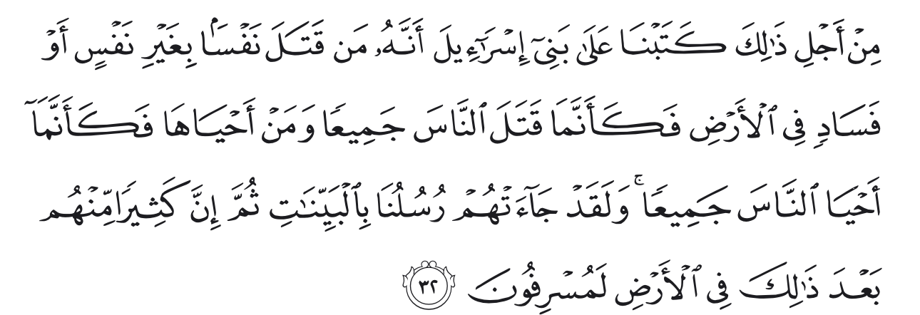 Oleh karena itu, Kami tetapkan (suatu hukum) bagi Bani Isrā`īl, bahwa barang siapa yang membunuh seorang manusia, bukan karena orang itu (membunuh) orang lain atau bukan karena membuat kerusakan di muka bumi, maka seakan-akan dia telah membunuh manusia seluruhnya1. Dan barang siapa yang memelihara kehidupan seorang manusia, maka seolah-olah dia telah memelihara kehidupan manusia semuanya. Dan sesungguhnya telah datang kepada mereka rasul-rasul Kami dengan (membawa) keterangan-keterangan yang jelas, kemudian banyak di antara mereka sesudah itu2 sungguh-sungguh melampaui batas dalam berbuat kerusakan di muka bumi. (QS. Al-Maidah: 32)