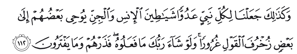 Dan demikianlah Kami jadikan bagi tiap-tiap nabi itu musuh, yaitu setan-setan (dari jenis) manusia dan (dan jenis) jin, sebagian mereka membisikkan kepada sebagian yang lain perkataan-perkataan yang indah-indah untuk menipu (manusia) Jikalau Tuhan-mu menghendaki, niscaya mereka tidak mengerjakannya, maka tinggalkanlah mereka dan apa yang mereka ada-adakan. (QS Al-An’am: 112)
