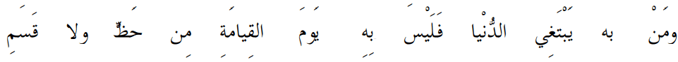 Barang siapa yang menghendaki keuntungan di akhirat akan Kami tambah keuntungan itu baginya dan barang siapa yang menghendaki keuntungan di dunia, Kami berikan kepadanya sebagian dari keuntungan dunia dan tidak ada baginya suatu bagian pun di akhirat. (QS. Asy-Syuuraa: 20)