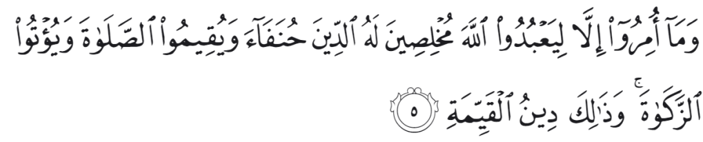 Padahal mereka tidak disuruh kecuali supaya menyembah Allah dengan memurnikan ketaatan kepada-Nya dalam (menjalankan) agama yang lurus dan supaya mereka mendirikan salat dan menunaikan zakat; dan yang demikian itulah agama yang lurus. (QS. Al-Bayinnah: 5)