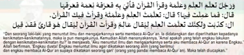 Dan seorang lelaku yang menuntut ilmu dan mengajarkannya serta membaca Al-Qur’an. Maka orang ini didatangkan, Allah ingatkan nikmat-nikmatnya terhadap orang ini. Orang ini pun mengingat nikmat itu. Maka ditanyakan kepadanya, apa yang kamu lakukan tentang nikmat itu? orang ini berkata saya mempelajari ilmu dan mengajarkan ilmu itu serta membaca Al-Qur’an karena engkau ya Allah. Allah berfirman, “Kamu telah berdusta!”. Kamu belajar ilmu supaya dikatakan Alim. Kamu baca Al-Qur’an supaya kamu dikatakan ahli membaca Al-Qur’an. Maka telah diucapkan. (Telah dikatakan orang itu alim dan qori).