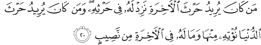 Siapa yang menghendaki kebun akhirat, kami tambah dia dalam kebunnya. Dan siapa yang menghendaki kebun dunia, kami beri kebun dunia. Tapi tidak ada bagiannya di akhirat.