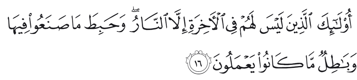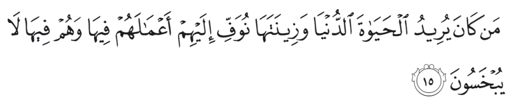 Barang siapa yang menghendaki kehidupan dunia dan perhiasannya, niscaya Kami berikan kepada mereka balasan pekerjaan mereka di dunia dengan sempurna dan mereka di dunia itu tidak akan dirugikan. (QS. Hud: `15) Itulah orang-orang yang tidak memperoleh di akhirat, kecuali neraka dan lenyaplah di akhirat itu apa yang telah mereka usahakan di dunia dan sia-sialah apa yang telah mereka kerjakan (QS. Hud): 1`6