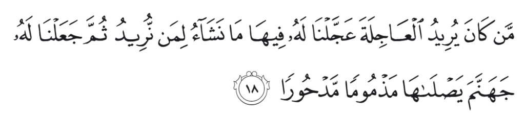 Barangsiapa yang menghendaki kehidupan yang segera (dunia), maka kami segerakan untuknya di dunia apa yang kalian kehendaki untuk siapa yang kami inginkan. Kemudian kami jadikan untuknya neraka jahanam, dia masuk didalamnya dalam keadaan dicela dan dihinakan.