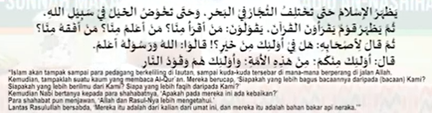 Akan tampak Islam, sampai para pedagang berkeliling kesana dan kesini dilautan. Sampai kuda-kuda dimana-mana berperang dijalan Allah (saking tersebarnya agama ini). Kemudian tampaklah satu kaum, mereka membaca al-qur’an. Lalu mereka berkata siapa yang lebih bagus bacaannya dari kami, siapa yang lebih berilmu dari kami, siapa yang lebih fakih dari kami (dia banggakan dirinya). Kemudian Nabi berkata kepada para sahabat “Apakah mereka-mereka (para pembaca Al-Quran seperti ini) ini ada kebaikan?”. Para sahabat menjawab “Allah dan Rasul-Nya yang lebih tahu”. Rasullaah mengatakan “mereka itu dari kalian ummat ini, dan mereka ini adalah pangang-panggang api neraka”. \