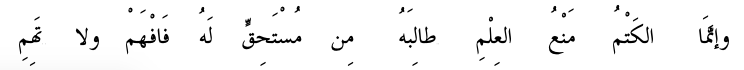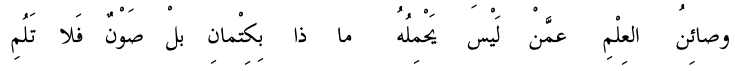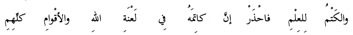 Bait Syair 79: Berhati-hatilah dari menyembunyikan ilmu, karena sesungguhnya … Orang yang menyembunyikannya berada dalam laknat Allah dan semua orang.Bait Syair 80: Salah satu hukumannya di akhirat kelak … AKan dipakaikan kepadanya kekang dari api Neraka yang tidak seperti kekang biasa.Bait Syair 81: Orang yang menahan ilmu dari orang yang tidak pantas membawanya … Tidaklah disebut menyembunyikan, akan tetapi merupakan bentuk penjagaan, maka janganlah kamu cela.Bait Syair 82: Menyembunyikan ilmu tiada lain menghalangi ilmu dari pencari … yang berhak mendapatkanya, maka pahamilah dan jangan keliru.