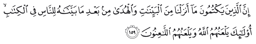 Sesungguhnya orang-orang yang menyembunyikan apa yang telah Kami turunkan berupa keterangan-keterangan (yang jelas) dan petunjuk, setelah Kami menerangkannya kepada manusia dalam Alkitab, mereka itu dilaknati Allah dan dilaknati (pula) oleh semua (makhluk) yang dapat melaknati, (Al-Baqarah:159)