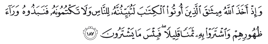 Dan (ingatlah), ketika Allah mengambil janji dari orang-orang yang telah diberi kitab (yaitu), “Hendaklah kamu menerangkan isi kitab itu kepada manusia, dan jangan kamu menyembunyikannya” lalu mereka melemparkan janji itu ke belakang punggung mereka dan mereka menukarnya dengan harga yang sedikit. Amatlah buruk tukaran yang mereka terima. (Al-Imran: 187)