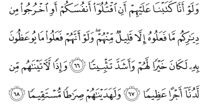 Dan sesungguhnya kalau Kami perintahkan kepada mereka, “Bunuhlah dirimu atau keluarlah kamu dari kampungmu”, niscaya mereka tidak akan melakukannya, kecuali sebagian kecil dari mereka. Dan sesungguhnya kalau mereka melaksanakan pelajaran yang diberikan kepada mereka, tentulah hal yang demikian itu lebih baik bagi mereka dan lebih menguatkan (iman mereka), dan kalau demikian, pasti Kami berikan kepada mereka pahala yang besar dari sisi Kami, dan pasti Kami tunjuki mereka kepada jalan yang lurus. (An-Nisa: 66-68)