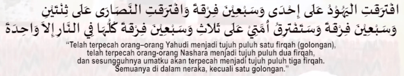 Dikatakan “Semuanya di dalam neraka”, ini merupakan ancaman dan tidak dipastikan semuanya dalam neraka. Karena dalam hadist dikatakan bahwa “umat ku akan berpecah”. Sehingga masih disebut umat nabi shallallahu alaihi wasallam. Ini juga menunjukan bahwa umat ini, ada yang keluar dari jalan. Yang kemudian diancam oleh neraka.