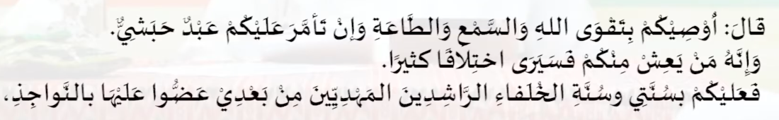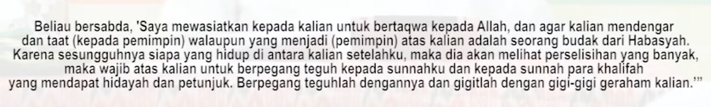 Sesungguhnya siapa yang hidup diantara kalian setelah ku maka dia akan melihat perselisihan pendapat yang banyak. Maka hendaknya kalian berpegang dengan sunnah ku, dan sunnah para Kulafa (4 khalifah: Abu Bakar, Umar, Ustman dan Ali) Ar-Rasyidin, yang mereka ini diatas ilmu dan mengamalkan dengan ilmunya.