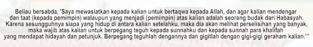 Saya wasiatkan kepada kalian untuk bertakwa kepada Allah mendengar dan taat kepada pemimpin walaupun yang menjadi pemimpin kalian seorang budak Habasy.