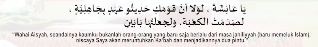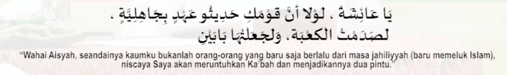 Sejarahnya Ka’bah awalnya dua pintu akan tetapi terjadi banjir yang meruntuhkan Ka’bah. Orang Quraish membangun kembali ka’bah akan tetapi degan satu pintu dikarenakan kekurangan biaya. Sehingga apabila Nabi robohkan dan bangun lagi sesuai dengan asalnya, dikhawatirkan orang quraish menjadi murtad lagi. Menjadikan kerusakan yang lebih besar.