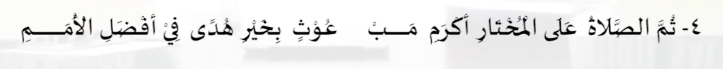 Bait 4: Kemudian shalawat selalu tercurah kepada Al-Mukhtar (Nabi Muhammad shallallahu ‘alaihi wasallam) yang merupakan sebaik-baik yang diutus, membawa petunjuk yang paling baik pada umat yang terbaik.