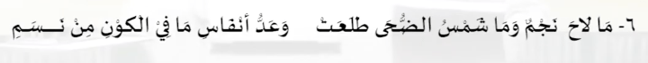 Bait 6: Shalawat ini sepanjang bintang masih bersinar dan sepanjang matahari duha masih terbit. Dan shalawat sebanyak nafas makhluk yang berada jagat semesta ini.