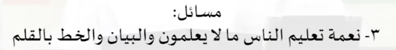 Di awal surat Ar-Rahman dan surat An-Nahl disebutkan nikmat yang terbesar yaitu nikmat Ilmu. Ini adalah nikmat yang terbesar, lebih besar dari kekuasaan, kedudukan, harta benda, anak dan istri, dan dunia beserta isinya. Apabila tidak belajar ilmu, maka tidak mengenal nikmat yang besar. Semakin memperdalam ilmu, maka akan semakin bersyukur kepada Allah.