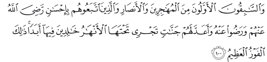 Orang-orang yang terdahulu lagi yang pertama-tama (masuk Islam) di antara orang-orang muhajirin dan ansar dan orang-orang yang mengikuti mereka dengan baik, Allah rida kepada mereka dan mereka pun rida kepada Allah dan Allah menyediakan bagi mereka surga-surga yang mengalir sungai-sungai di dalamnya; mereka kekal di dalamnya selama-lamanya. Itulah kemenangan yang besar.