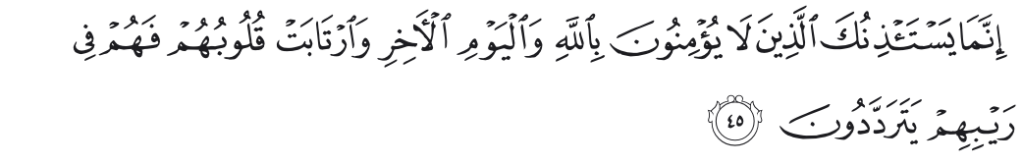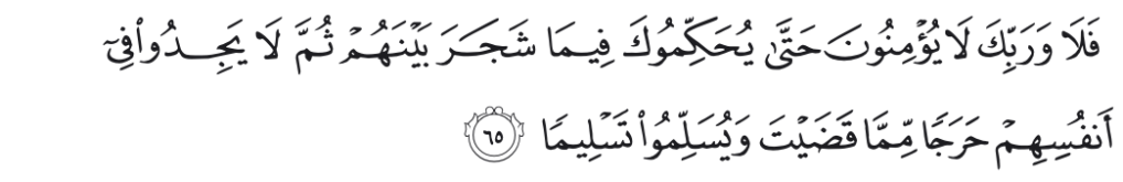 Maka demi Tuhan-mu, mereka (pada hakikatnya) tidak beriman hingga mereka menjadikan kamu hakim dalam perkara yang mereka perselisihkan, kemudian mereka tidak merasa keberatan dalam hati mereka terhadap putusan yang kamu berikan, dan mereka menerima dengan sepenuhnya.