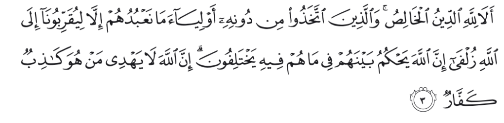 Ingatlah, hanya kepunyaan Allah-lah agama yang bersih (dari syirik). Dan orang-orang yang mengambil pelindung selain Allah (berkata), “Kami tidak menyembah mereka, melainkan supaya mereka mendekatkan kami kepada Allah dengan sedekat-dekatnya”. Sesungguhnya Allah akan memutuskan di antara mereka tentang apa yang mereka berselisih padanya. Sesungguhnya Allah tidak menunjuki orang-orang yang pendusta dan sangat ingkar.