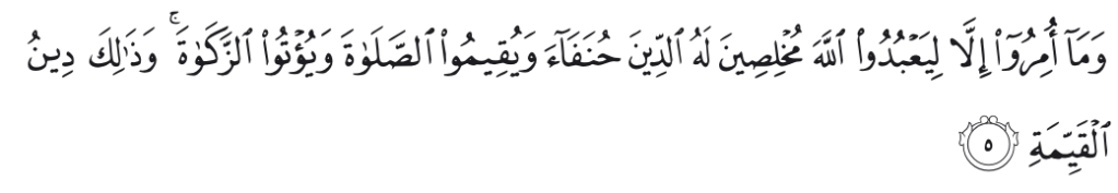 Padahal mereka tidak disuruh kecuali supaya menyembah Allah dengan memurnikan ketaatan kepada-Nya dalam (menjalankan) agama yang lurus dan supaya mereka mendirikan salat dan menunaikan zakat; dan yang demikian itulah agama yang lurus.