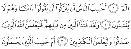 Alif Lām Mīm, Apakah manusia itu mengira bahwa mereka dibiarkan (saja) mengatakan, “Kami telah beriman”, sedang mereka tidak diuji lagi?, Dan sesungguhnya kami telah menguji orang-orang yang sebelum mereka, maka sesungguhnya Allah mengetahui orang-orang yang benar dan sesungguhnya Dia mengetahui orang-orang yang dusta.