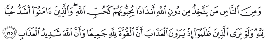 Dan diantara manusia ada orang-orang yang menyembah tandingan-tandingan selain Allah; mereka mencintainya sebagaimana mereka mencintai Allah. Adapun orang-orang yang beriman sangat cinta kepada Allah. Dan jika seandainya orang-orang yang berbuat zalimitu mengetahui ketika mereka melihat siksa (pada hari kiamat) bahwa kekuatan itu kepunyaan Allah semuanya, dan bahwa Allah amat berat siksaan-Nya (niscaya mereka menyesal).