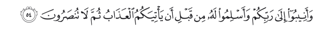 Dan kembalilah kamu kepada Tuhan-mu dan berserah dirilah kepada-Nya sebelum datang azab kepadamu, kemudian kamu tidak dapat ditolong (lagi).