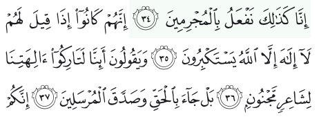 Sesungguhnya mereka dahulu apabila dikatakan kepada mereka, “Lāilāha illallāh” (Tiada Tuhan yang berhak disembah, melainkan Allah) mereka menyombongkan diri.dan mereka berkata, “Apakah sesungguhnya kami harus meninggalkan sembahan-sembahan kami karena seorang penyair gila?”