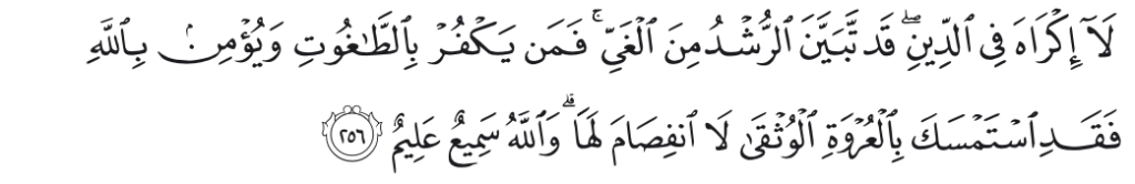 Tidak ada paksaan untuk (memasuki) agama (Islam); sesungguhnya telah jelas jalan yang benar daripada jalan yang sesat. Karena itu, barang siapa yang ingkar kepada ṭāgūt dan beriman kepada Allah, maka sesungguhnya ia telah berpegang kepada buhul tali yang amat kuat yang tidak akan putus. Dan Allah Maha Mendengar lagi Maha Mengetahui.